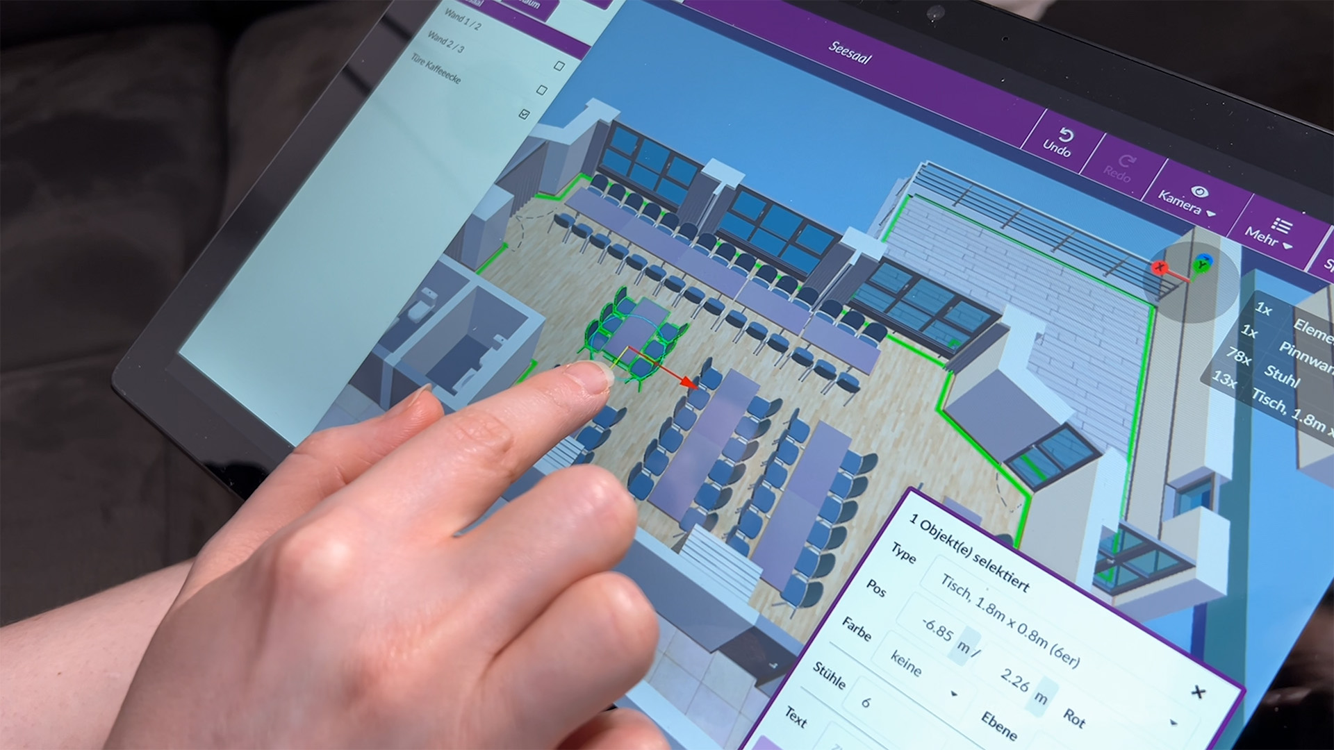 Die Mobiliarübersicht enthält den vollständigen Katalog möglicher Möbelstücke, die per Drag & Drop in die Szene gezogen werden können. Zusätzlich sorgen spezielle Funktionen wie das Anordnen von Stühlen an Tischen oder Mobiliar stapeln für flexible Gestaltungsmöglichkeiten.