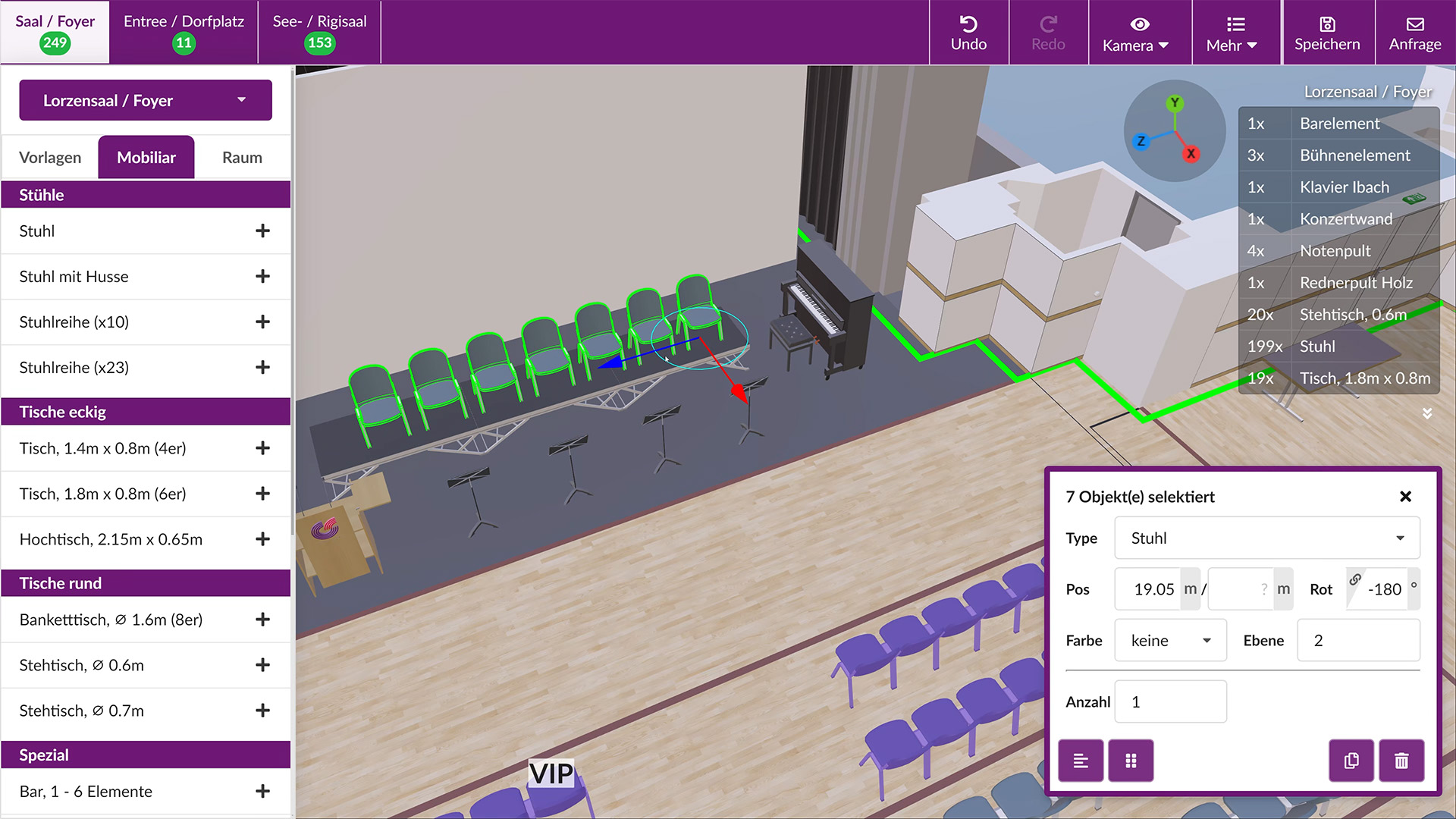 Der 3D Eventraum-Konfigurator ist eine webbasierte Lösung, die Veranstaltern eine interaktive und visuelle Eventgestaltung ermöglicht. Mit der intuitiven Benutzeroberfläche lassen sich Raumlayouts, Bestuhlungsoptionen, Bühnenanpassungen und Bodenabsenkungen mühelos gestalten.