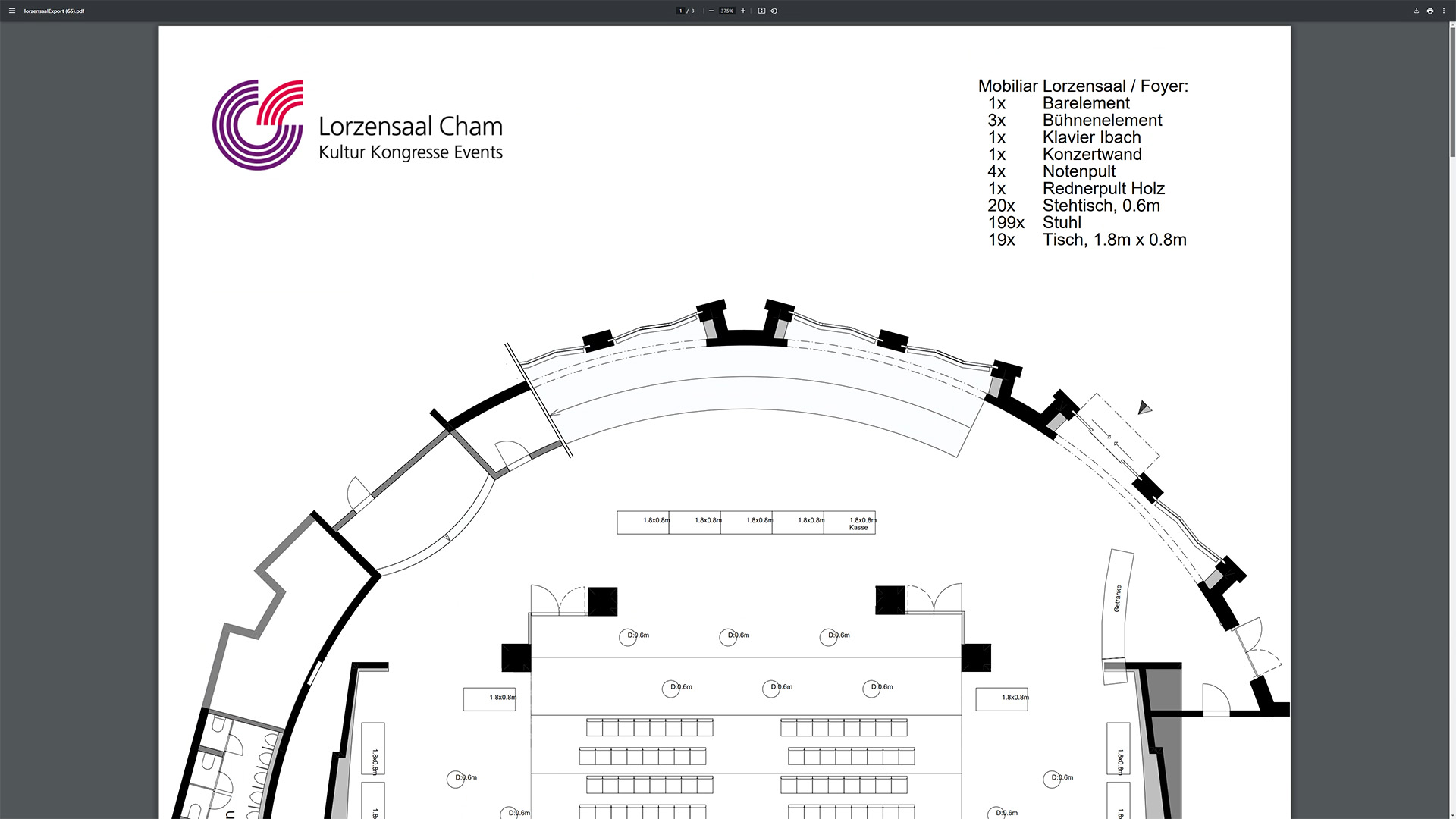 Geplante Räume können inklusive Mobiliarstatistik als massstabsgetreues 2D-PDF exportiert und weiterverwendet werden. Dieses enthält die Grundrisse der Räume, die Konfiguration, sämtlich verwendetes Mobiliar, die Mobiliar-Statistik, eingegebene Bemerkungen, Gruppierungen und Farbcodes.