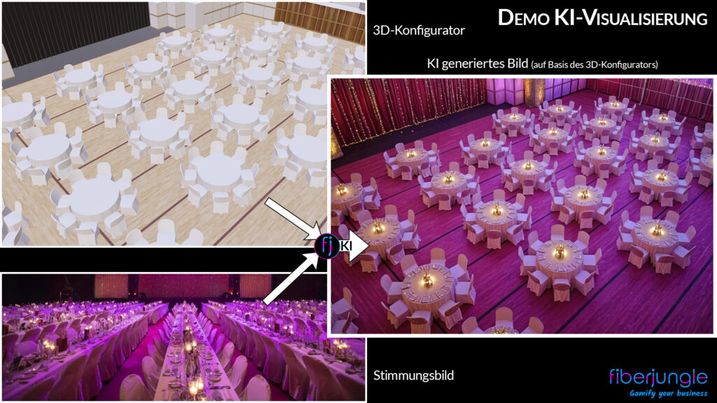 Ob für Kundengespräche, Konzepte oder zu Marketingzwecken: Unser 3D-Konfigurator mit KI-Visualisierung bringt Emotion und Klarheit in Ihre Eventplanung. Die Bilder lassen sich ganz einfach aus jedem beliebigen Blickwinkel im Konfigurator generieren.
